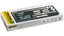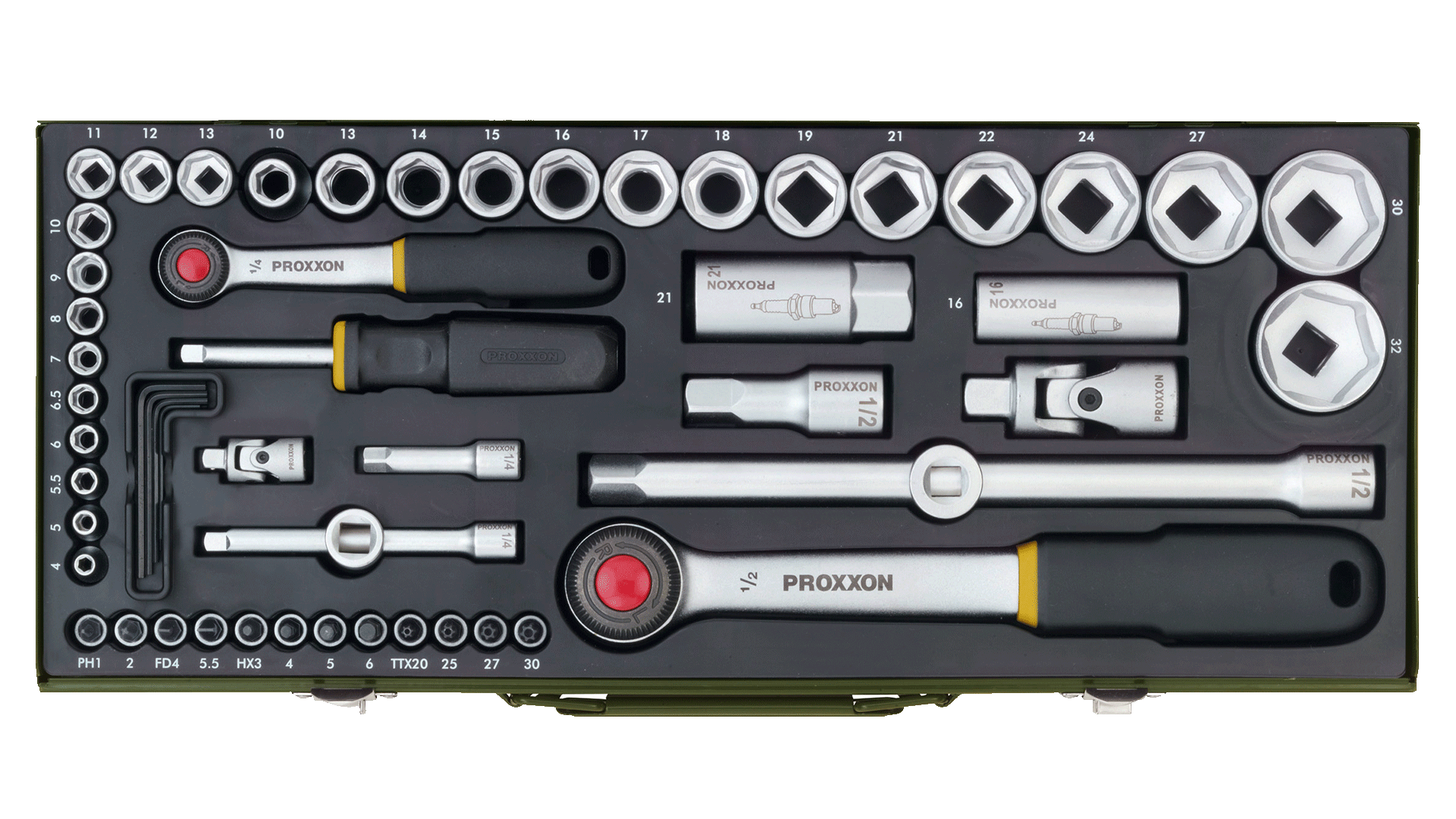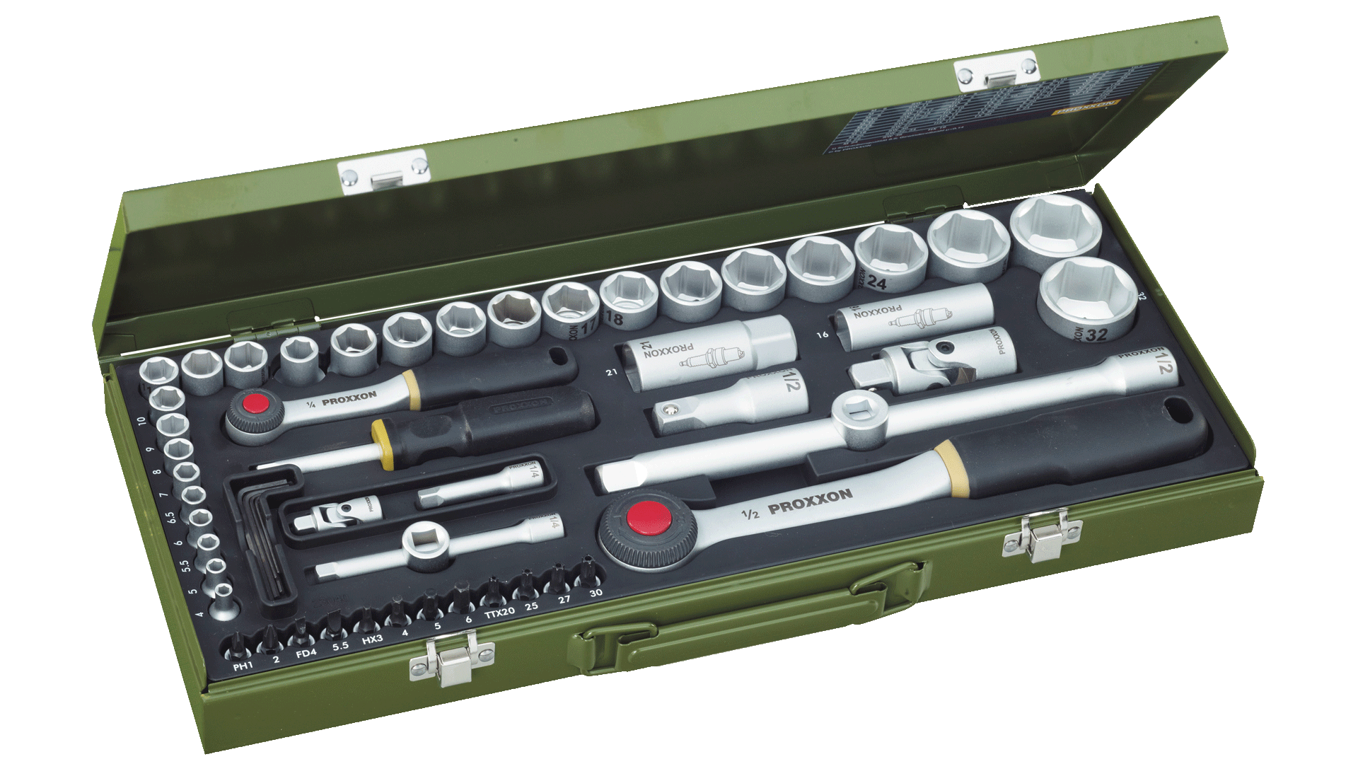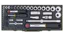 Steckschlüsseleinsätze von 4 - 32 mm. Zündkerzenspezialeinsätze 16 und 21 mm. Schraubereinsätze mit Vierkantantrieb für Schlitzschrauben, Kreuzschlitzschrauben, TX-Schrauben (mit stirnseitiger Bohrung) und Innensechskantschrauben. Innensechskantschlüssel (abgewinkelt) Gr. 1,25 - 1,5 - 2,0 - 2,5 und 3,0 mm. Sonstiger Inhalt siehe Abbildung.