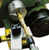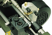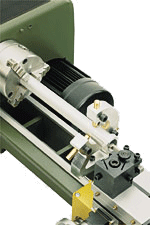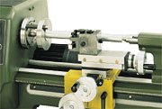 Spindelstock: Aus Alu-Druckguss. Überdimensionale Hauptspindel mit zwei nachstellbaren Kegelrollenlagern und MK 3-Aufnahme futterseitig. Spindeldurchlass 20,5 mm. Rundlaufgenauigkeit ohne Futter 1/100 mm. Drehschalter für die Zuschaltung des automatischen Vorschubs (wahlweise 0,07 und 0,14 mm/U). Leit- und Zugspindel mit Trapezgewinde (12 x 1,5 mm).