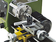 Support: Bettschlitten aus Zink-Druckguss. Querschlitten (Verstellweg 85 mm) und Oberschlitten (Verstellweg 52 mm) aus Stahl. Oberschlitten zum Kegeldrehen schwenkbar (Gradeinteilung bis 45° vorhanden). Mit Mehrfachstahlhalter und zwei Stahlhalter-Elementen für schnellen Wechsel und problemlose Höhenjustierung. Für Drehstähle 10 x 10 mm.