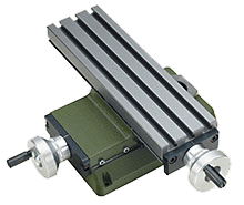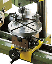 Inklusive Säule (35 x 400 mm), Anbauflansch und Befestigungsschrauben. Zum Anflanschen an die PD 400. An Stelle des Stahlhalters wird ein dazu gehörender Nutentisch (110 x 70 mm, mit drei T-Nuten 12 x 6 x 5 mm) auf dem Oberschlitten fixiert. Die Drehmaschine ersetzt nun den Koordinatentisch (Verstellung über Längsvorschub und Querschlitten). Der Bohrkopf ist identisch mit dem der Feinfräse FF 230. Inkl. drei Spannzangen (6, 8 und 10 mm).