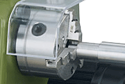 Drehfutter: Hochwertiges 3-Backen-Futter nach DIN 6386, Klasse 1 (Rundlauftoleranz 0,04 mm). Spannbereich durch Wendebacken 3 - 100 mm. Dazu Drehfutterschutz mit Sicherheitsabschaltung.