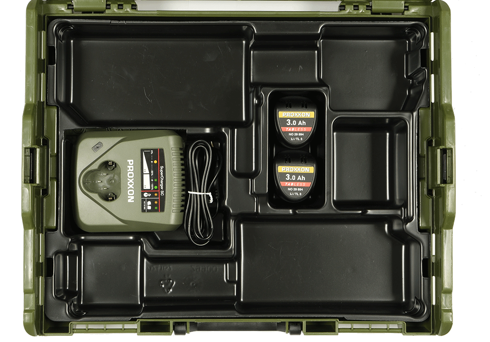Im bewährten L-BOXX-System. Mit hochwertiger Formeinlage zur Aufnahme von zwei Akku-Geräten. Ermöglicht bedarfsgerechte Geräteauswahl für Gewerke wie Fliesenlegerarbeiten, Metall- und Geländerbau, Automobilbereich, Innenausbau, Instandhaltung. Mit reichlich Platz für Zubehör.