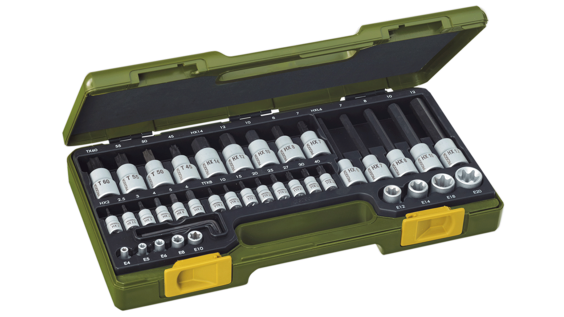 Screwdriver bits for Allen screws sizes 7 - 14mm (short version, 55mm) and sizes 6 - 12mm (long version, 100mm), for TX screws sizes 45 - 60 (short version) and for external TX sizes E12 to E20. Includes 5 angled Allen keys in 1.25 - 1.5 - 2.0 - 2.5 and 3.0mm.