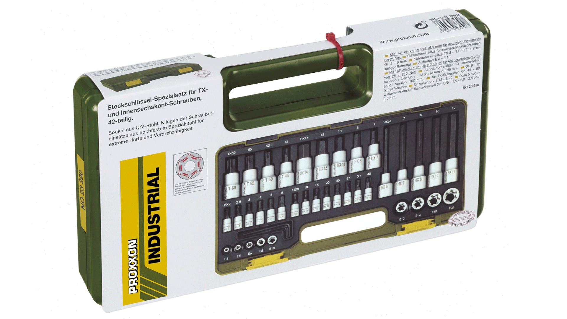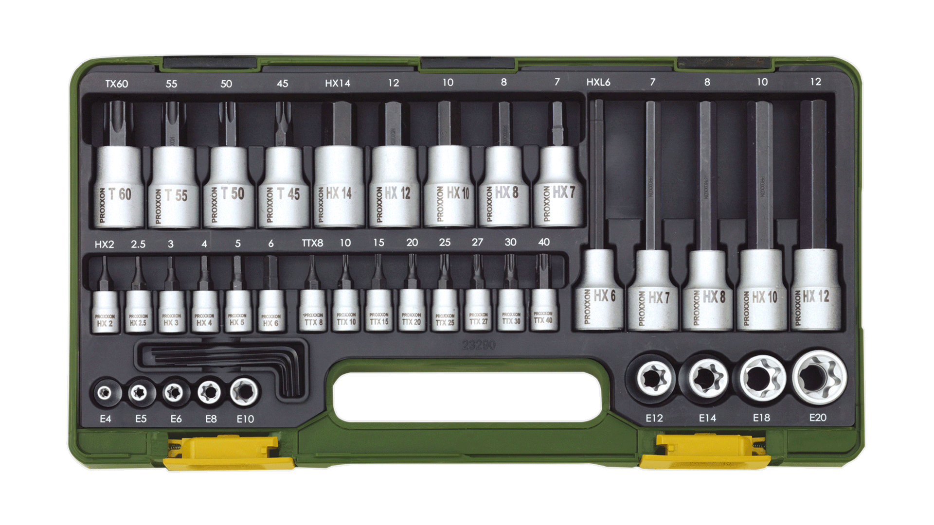 See photo for full contents. Comes in compact and solid plastic case - composition and design copyright by PROXXON.