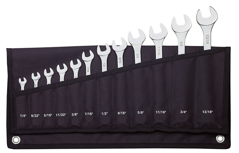 Spanner sizes: 1/4'' - 9/32'' - 5/16'' - 11/32'' - 3/8'' - 7/16'' - 1/2'' - 9/16'' - 5/8'' - 11/16'' - 3/4'' and 13/16''. With durable laser marking and large, clearly readable imperial sizes. Polished heads, slim and thin-walled. Optimal surface protection (double nickel-plating and single matt chrome plating) with comfortable, smooth finish.