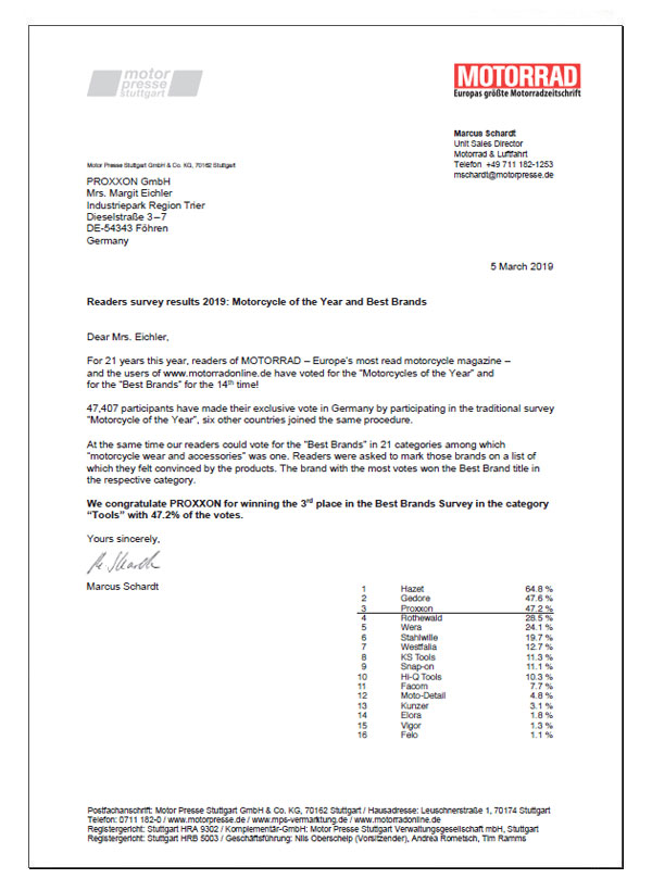 PROXXON est une fois de plus l'une des meilleures marques de l'année. C'est le résultat du choix des lecteurs de MOTORRAD en 2019 - le plus grand magazine moto d'Europe.