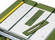 Non-slotted sawing cap cover of ABS for tight tolerances between saw blade and table (is slotted from below by the FET saw blade). For cutting very small parts.