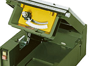 Table and drive can be lifted up and supported like an engine bonnet. For cleaning the device and easy saw blade replacement.