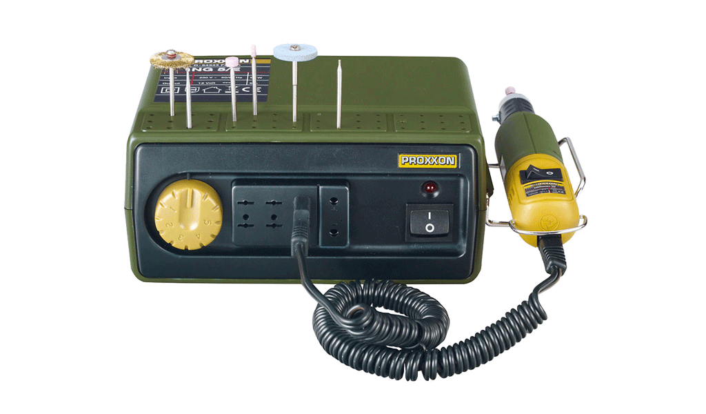 Power consumption of portable machine tools is measured according to the internationally accepted ICE-745-1 specification. The current drawn is measured, not the power consumption with a hot motor just before stalling. In practice, this condition seldom appears, if ever. All PROXXON AC adapters are suitably dimensioned for the recommended purposes.